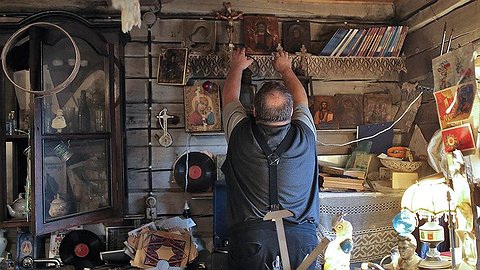 А ведь обычным людям эта странная изба, уверяет старьевщик, нравится — вот же книга отзывов, вот мелким почерком "Спасибо за сахарницу", вот крупно и размашисто "Низкий поклон из Молдовы хозяину дома-музея", вот "Мы еще из тех годов, храните нашу память!". Крайнов потирает грудь: "Главные нервы мне всегда делали не бандиты, не воры, не пьяницы, а чиновники. Почему они всегда лезут?.. Это ведь мой дом, мой! Да, придорожная торговля запрещена. Но если я захочу, то могу вас, к примеру, пригласить в гости. Так? Захочу — подарю все-таки эту тарелочку, да? И приму от вас материальную помощь, 200 рублей... Или 100?"