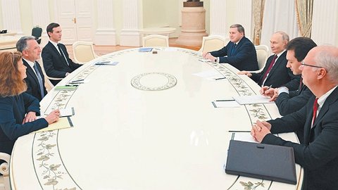 От американской стороны на встрече в Кремле также присутствовал предприниматель, инвестор, основатель компании Affinity Partners Джаред Кушнер. От российской стороны - помощник президента РФ Юрий Ушаков и спецпредставитель президента РФ по инвестиционно-экономическому сотрудничеству с зарубежными странами, гендиректор РФПИ Кирилл Дмитриев. Все собрались за круглым столом, ключевая тема встречи - урегулирование украинского кризиса, в том числе предложения США по этому вопросу.